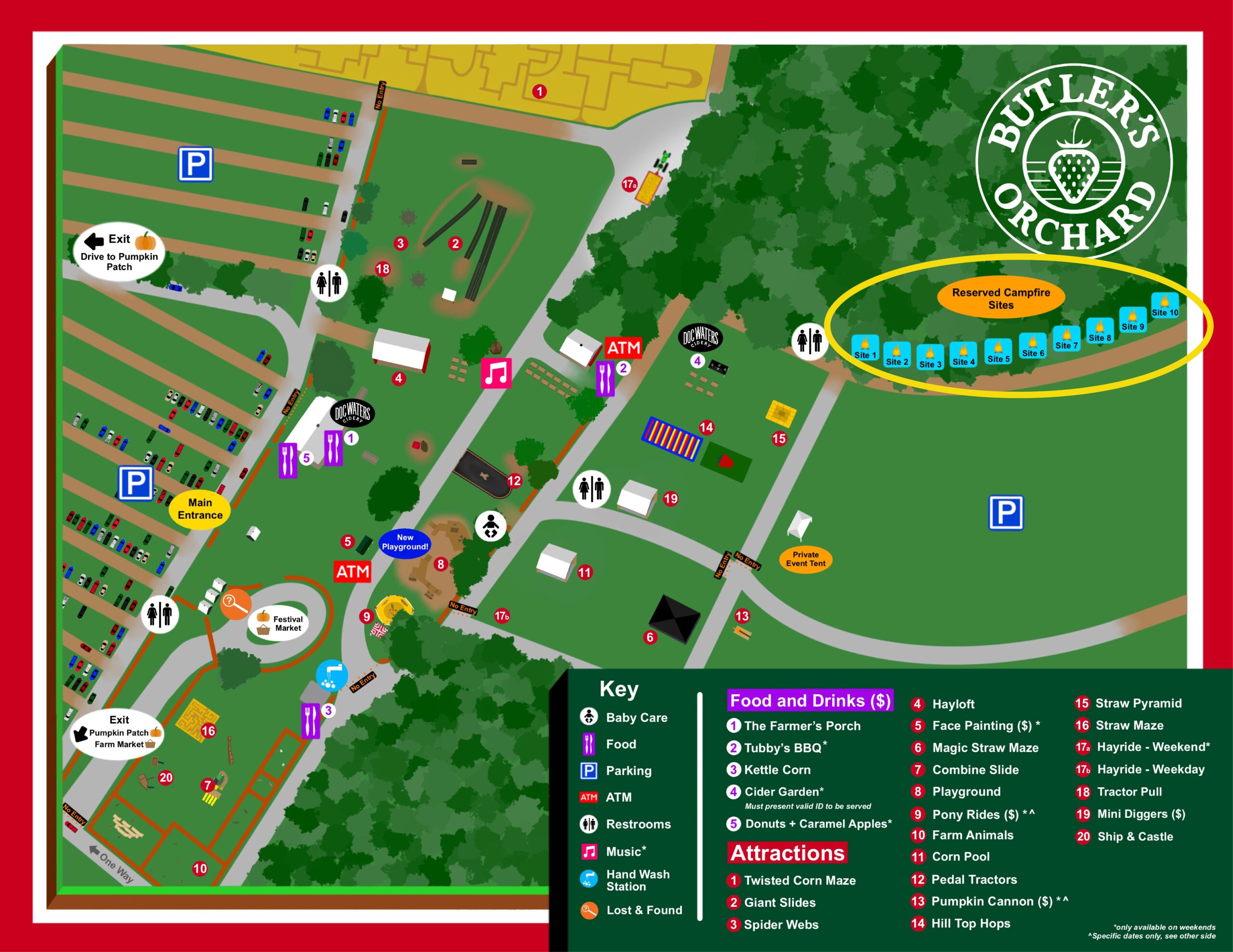 Visiting the Farm is a weather dependent event. If there is any doubt about the weather, please check our website, Facebook, or Instagram for updates on the morning of your visit. You can also call 301-428-0444. If Butler’s Orchard closes the Pumpkin Festival due to inclement weather, we are happy to help you reschedule your Campfire Site or we will refund your Campfire Site reservation fee. Pre-purchased Festival tickets for entry may be transferred to another date or may be returned by the party host only for a refund through our office (applicable only if Butler’s Orchard closes the Pumpkin Festival).
