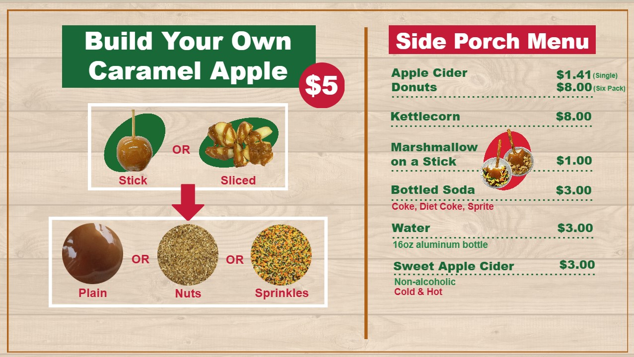 Caramel Apples are located on the side of the Farmer’s Porch. Menu is subject to change due to availability. For a list of any sold out items, visit the Farmer’s Porch!
