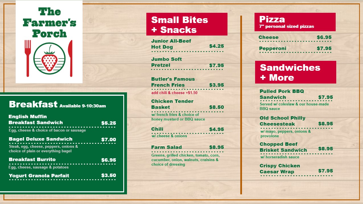 The Farmer’s Porch, located in our Farm Park, has an array of small bites, sandwiches, pizzas and more! Chef Jay has created dishes for everyone in the family alongside a rotation of seasonal offerings that take advantage of fresh picked fruits and vegetables.
